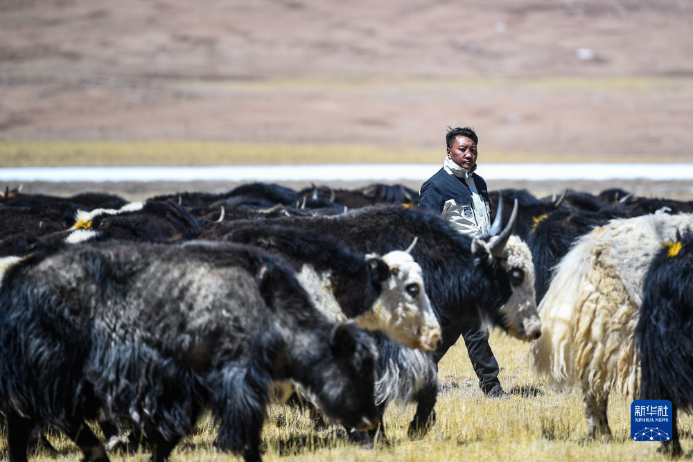 尼瑪才仁正在草場查看牦牛(4月20日攝)。新華社記者 張龍 攝