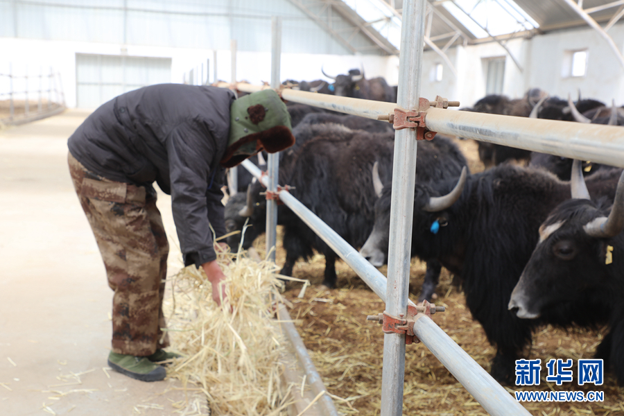 在天峻縣陽康鄉(xiāng)牦牛核心群培育基地內,工作人員在給牦牛投放飼草。新華網(wǎng) 吳婷婷 攝