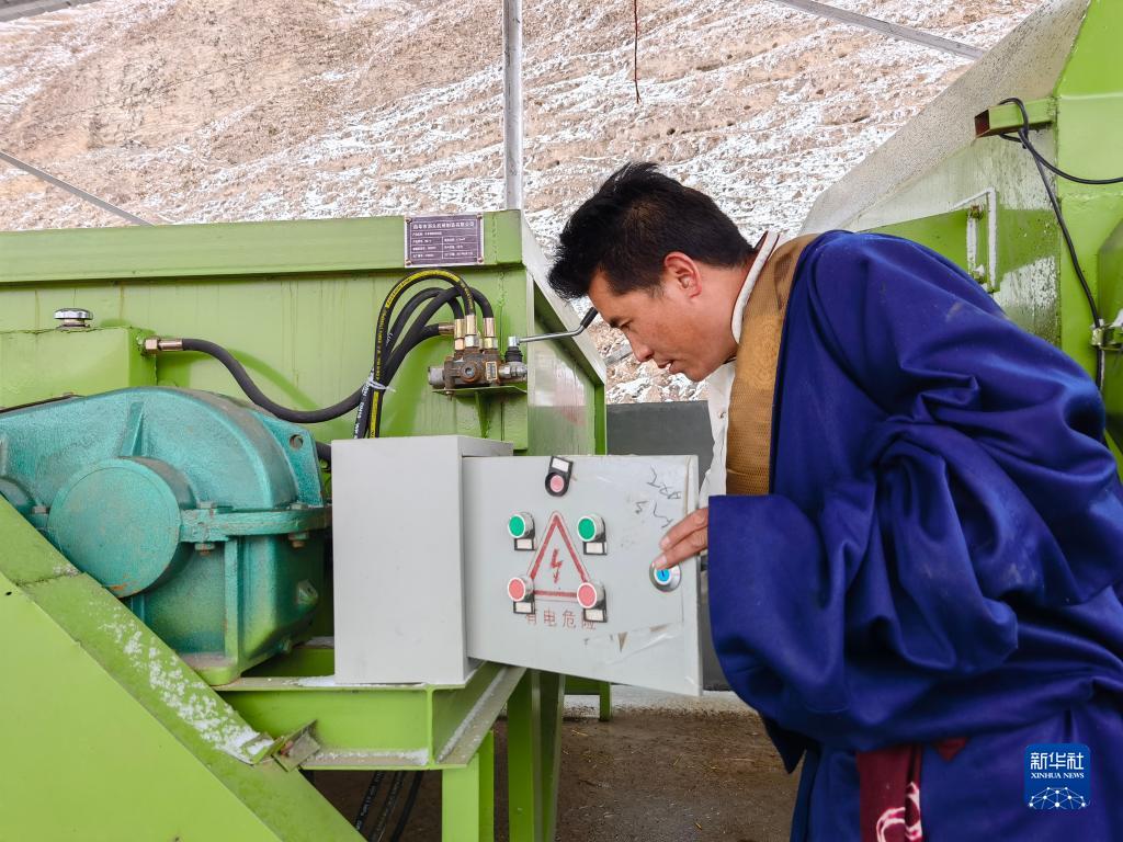 4月27日,在青海省玉樹藏族自治州稱多縣三江源高原現(xiàn)代生態(tài)牧業(yè)示范點(diǎn),工作人員在清理草料拌料機(jī)。新華社記者 柳澤興 攝