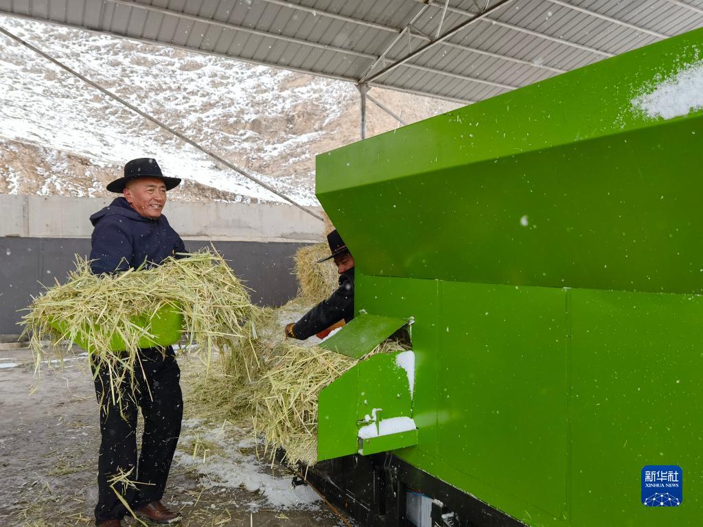 4月27日,在青海省玉樹藏族自治州稱多縣三江源高原現(xiàn)代生態(tài)牧業(yè)示范點(diǎn),昂巴拉農(nóng)牧民專業(yè)合作社理事長布德在處理草料。新華社記者 柳澤興 攝