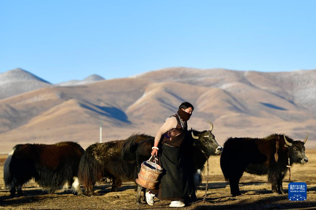 2020年10月28日,在青海省玉樹藏族自治州稱多縣珍秦鎮(zhèn),牧民準(zhǔn)備給牦牛擠奶。新華社記者 張龍 攝