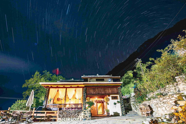 白天的色龍村,云霧飄浮在山腰,牛群慵懶地穿行于林間,恬靜閑適,及至餐時,炊煙裊裊,一派祥和。夜晚,靜謐的村莊被燈火次第點亮,像是墜落于高原山間的星河,璀璨耀眼,浪漫迷人。
