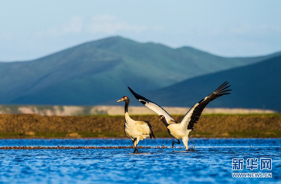 在距污水處理廠不遠的濕地中,黑頸鶴時而低頭涉水覓食,時而遨游天際。才項南加的鏡頭跟隨黑頸鶴移動,他轉過頭說:“污水廠水排放達標,污水變凈水,黑頸鶴才會在這里駐足!”
