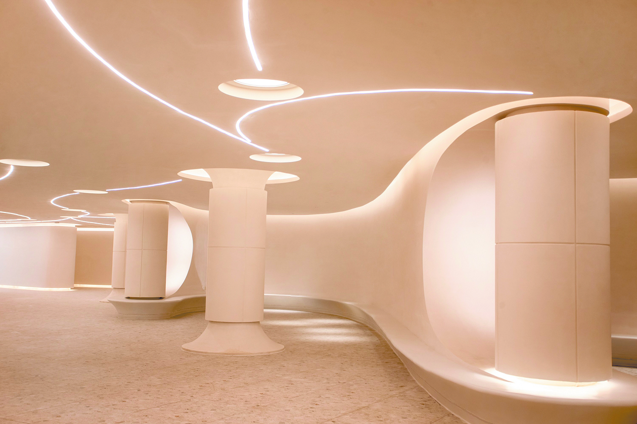 “看見九寨”大樓內(nèi)的10余個空間里,設(shè)計團(tuán)隊用不同的色彩和科技表現(xiàn)手法表達(dá)出不同的舒緩風(fēng)格,治愈人心?!蔼氉孕褋怼彼囆g(shù)館運(yùn)用弧形和曲線,將空間切割出曼妙的身形,輕盈靈動,淺黃柔色的燈光彌漫著溫柔氣息;以白色調(diào)為主的“九寨時光”圖書館,能讓人從浮躁中快速安靜下來。
