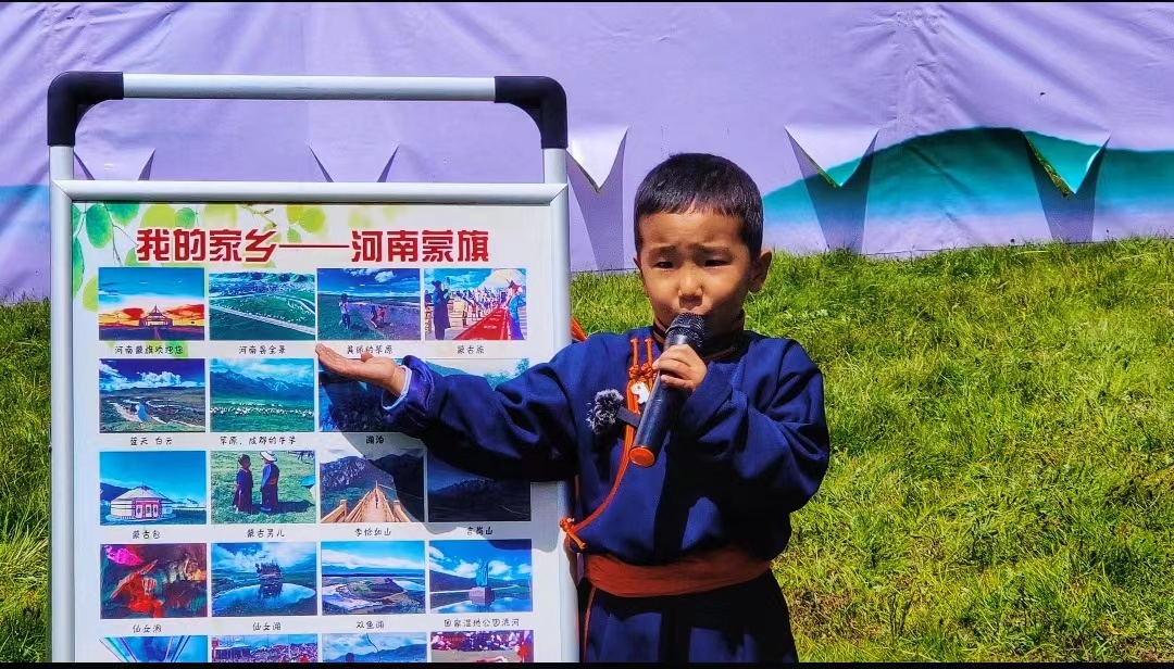 “我的家鄉(xiāng)在中國(guó)西部,這里有一片非常美麗的大草原,大家都喜歡叫她‘河南蒙旗’,這里有藍(lán)天、白云、草原、牛羊、湖泊、河流……”來自青海省黃南藏族自治州河南蒙古族自治縣中心幼兒園五歲半的觀卻東珠作為“講解員”,正聲情并茂的向老師、同學(xué)以及家長(zhǎng)介紹自己的家鄉(xiāng)。