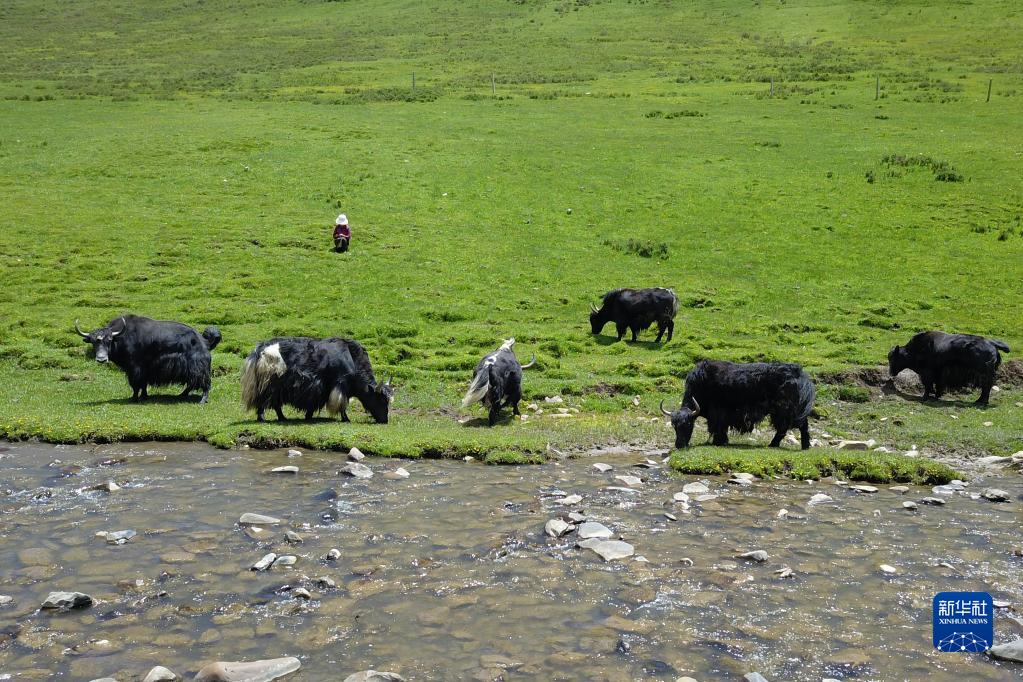 這是7月4日在稱多縣歇武鎮(zhèn)牧業(yè)村拍攝的牦牛養(yǎng)殖基地一角(無人機(jī)照片)。新華社記者 范培珅 攝