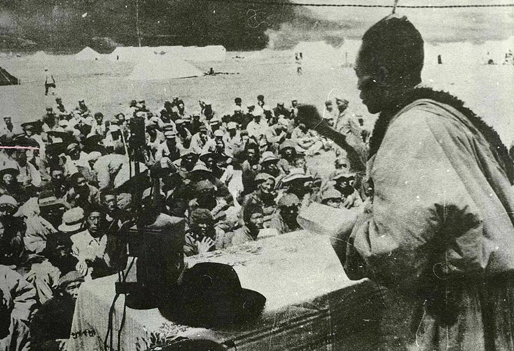 圖為1952年8月工作團(tuán)在達(dá)日縣查郎寺召開果洛頭人、代表聯(lián)誼會議,扎喜旺徐團(tuán)長在聯(lián)誼會議上作有關(guān)民族團(tuán)結(jié)的報告。圖片由央金提供