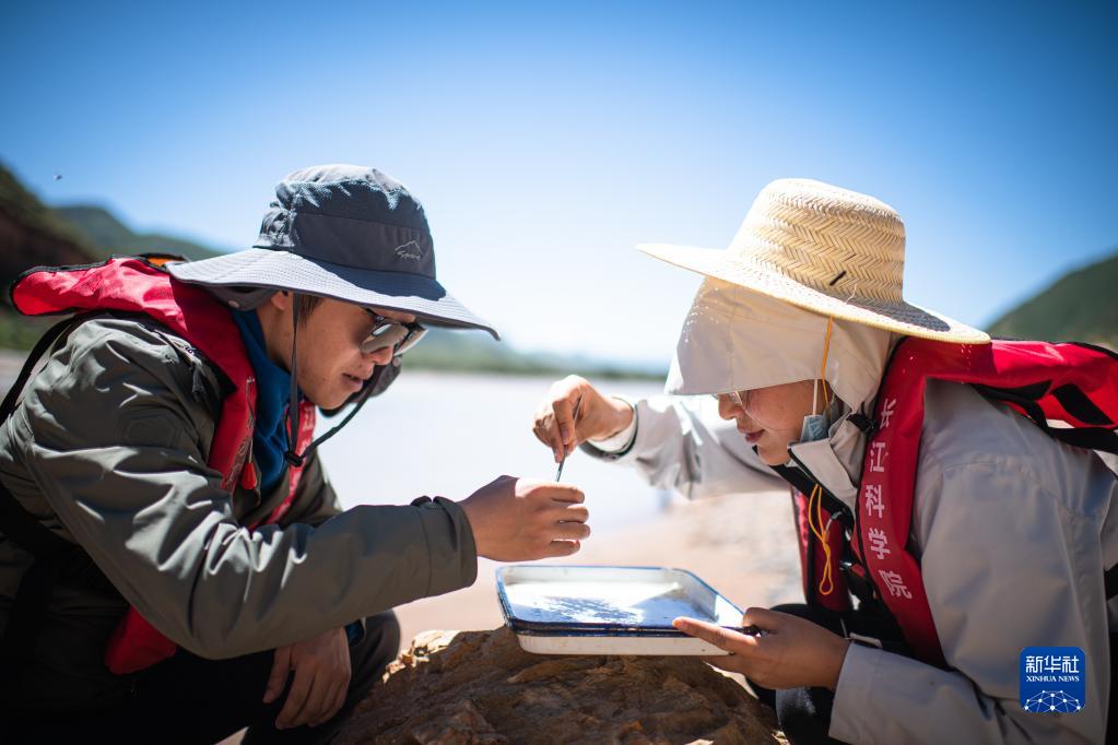 7月24日,長江科學院科考隊員李魯?shù)ぃㄓ遥┡c劉晗在瀾滄江源區(qū)的扎曲采集底棲動物樣本。新華社記者 肖藝九 攝