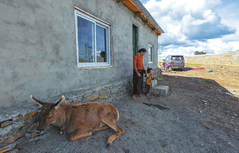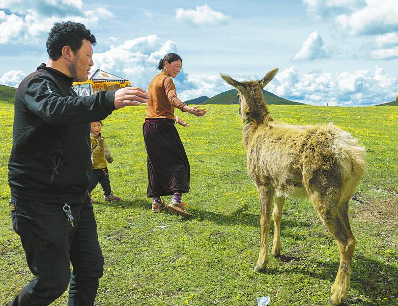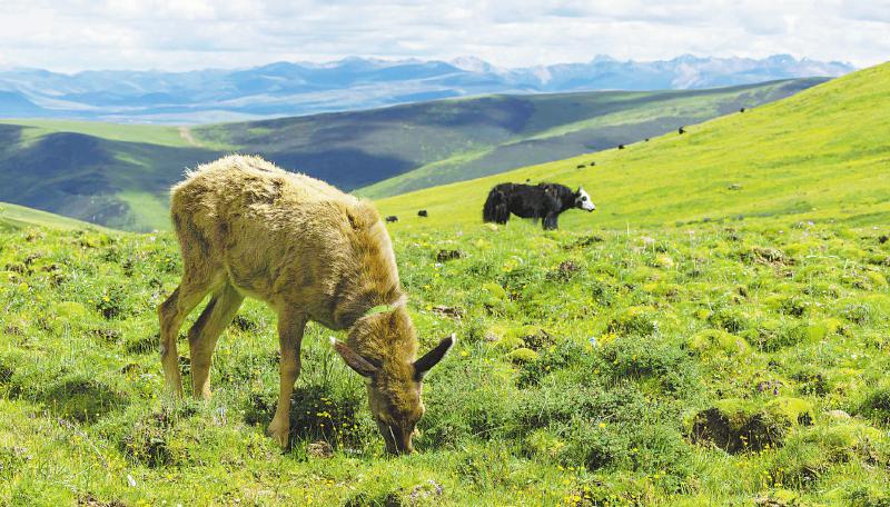 小白唇鹿每天都會跟著達(dá)瓦拉姆家的牦牛群在高原牧場吃草玩耍。尹鋼 攝