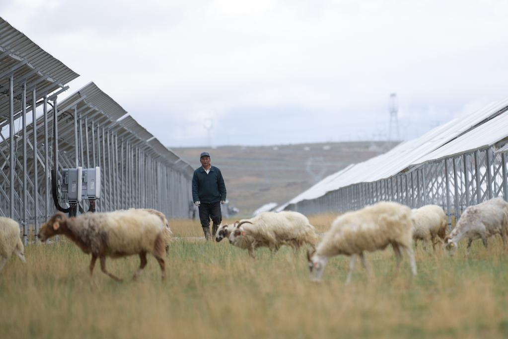 牧民在共和縣塔拉灘華能青海公司光伏電站內(nèi)放羊(6月9日攝)。新華社記者 張龍 攝