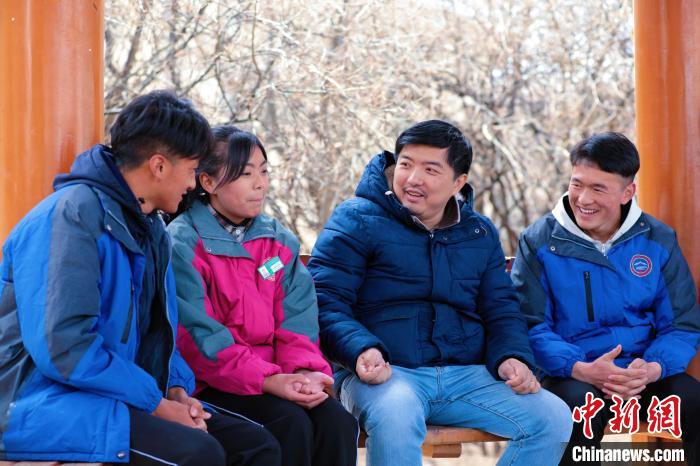 圖為丁志偉(右二)正在與學(xué)生聊天。上海市援青干部聯(lián)絡(luò)組供圖