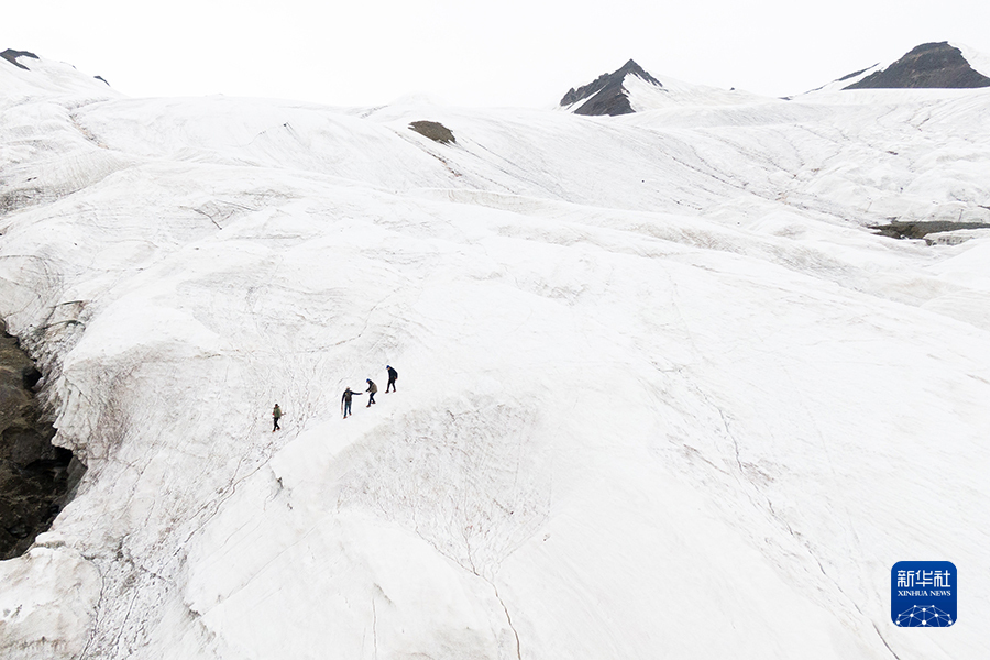 7月28日,來自長江科學院的科考隊員在長江源格拉丹東雪山上(無人機照片)。新華社記者肖藝九 攝