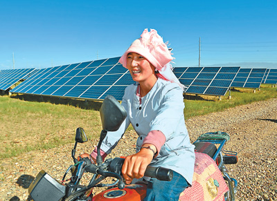 落日余暉中,牧民索南卓瑪騎著一輛摩托車,沿著歸家的方向,緩緩跟在羊群后面?!白詮难b了光伏板,生態(tài)治理同步發(fā)力,一些戈壁灘變成了綠地,我們的生活也越來越好了。”對(duì)眼前土地發(fā)生的變化,生于斯長于斯的索南卓瑪深有感觸。