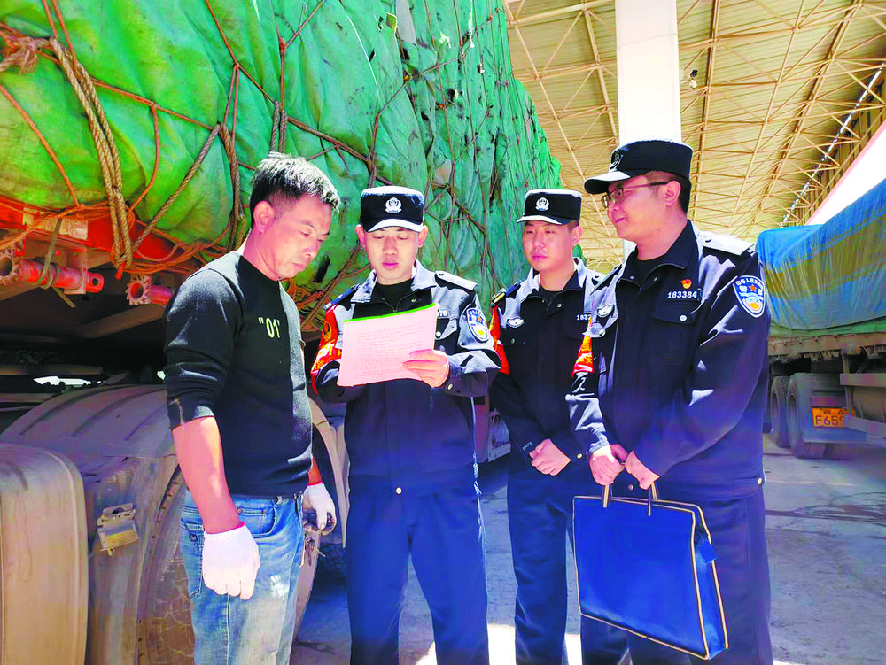 沱沱河站派出所所長(zhǎng)沈衛(wèi)平(左二)和民警們一起向客車司機(jī)宣傳愛(ài)路護(hù)路知識(shí)。青藏鐵路公安局格爾木公安處供圖