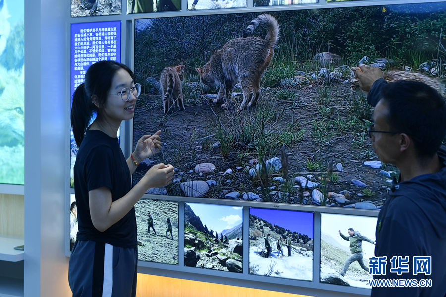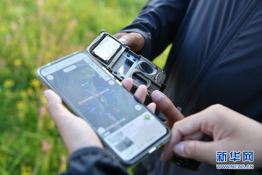 孔玥嶠和生態(tài)管護員正在查看野外布設(shè)的紅外相機的相關(guān)數(shù)據(jù)。新華網(wǎng) 卡婭梅朵 攝