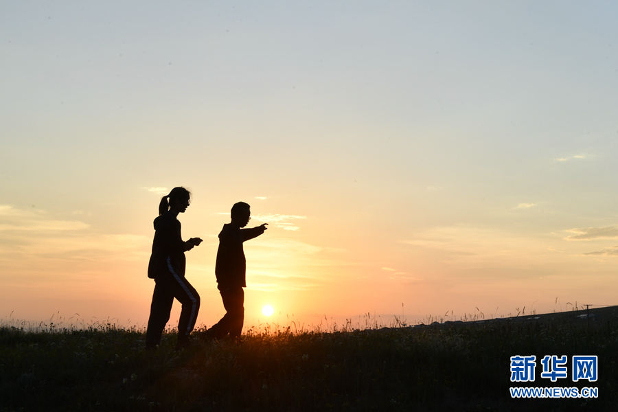 伴著夕陽,孔玥嶠正在和生態(tài)管護員交流工作。新華網(wǎng) 卡婭梅朵 攝