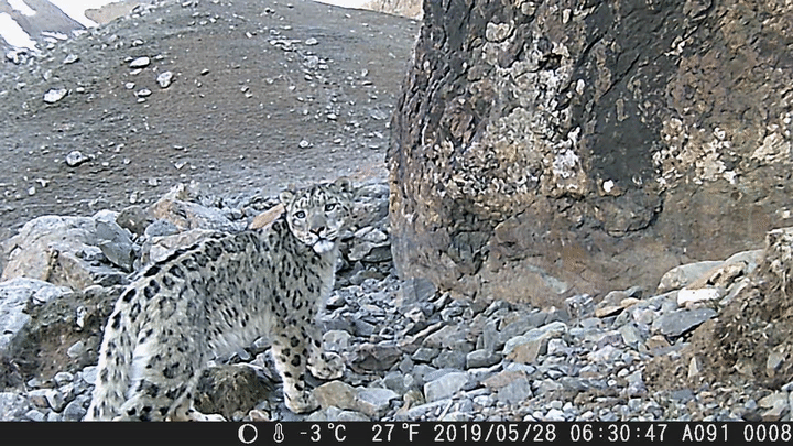 “我時常覺得,與其說是我們觀察雪豹,不如說是雪豹在觀察我們,它觀察我們,比我們觀察它要容易得多?!睋?jù)王大軍講述,有一次,團隊追蹤到一只雪豹的身影停留在山間,但遠遠望去,只有一條尾巴露在外面。通過攝影設(shè)備拉近畫面,才發(fā)現(xiàn)原來那只雪豹的雙眼也正在透過巖石的縫隙,觀察著他們。