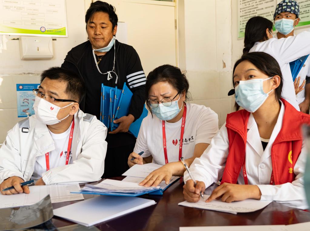 桑周拉毛(右一)正在記錄患者病情。新華社記者 謝晗 攝