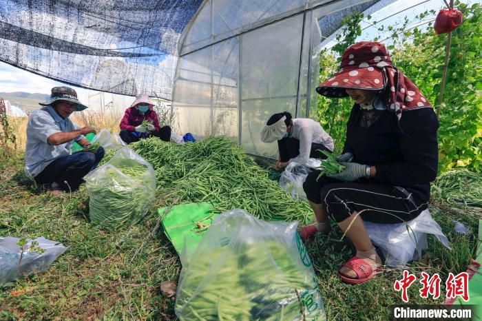 熱布卡蔬菜基地內(nèi),工人正在將剛采摘的四季豆篩選裝袋。王磊 攝