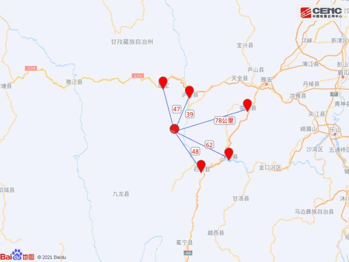 震中距瀘定縣39公里、距康定市47公里、距石棉縣48公里、距漢源縣62公里、距滎經(jīng)縣78公里,距甘孜藏族自治州52公里,距成都市226公里。
