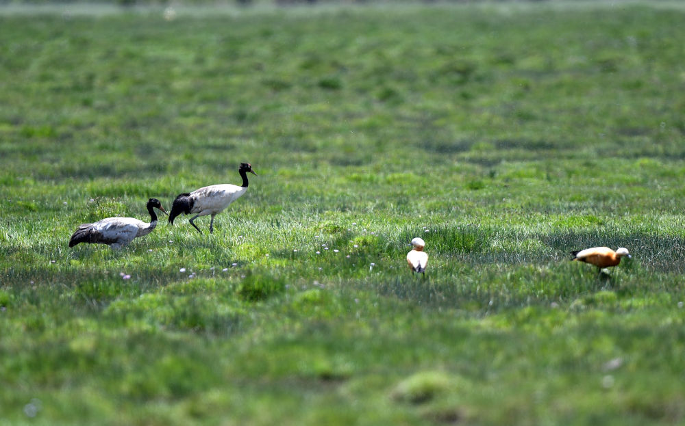 2022年7月2日,兩只黑頸鶴(左一和左二)在青海隆寶國(guó)家級(jí)自然保護(hù)區(qū)內(nèi)活動(dòng)。新華社記者 韓方方 攝