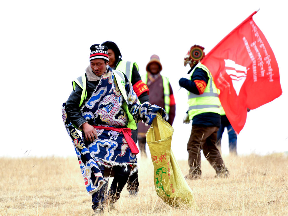 在三江源國(guó)家公園黃河源園區(qū),扎陵湖鄉(xiāng)生態(tài)保護(hù)站勒那村生態(tài)管護(hù)隊(duì)第七組的隊(duì)員在撿拾垃圾(2018年12月2日攝)。新華社記者 張龍 攝