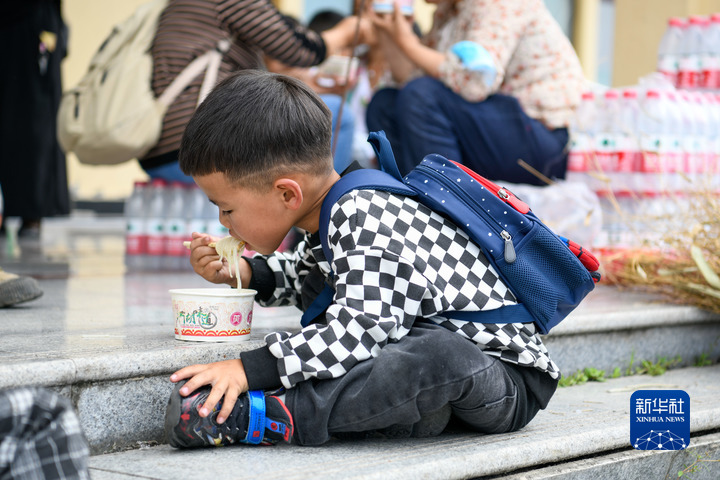 9月6日,在位于石棉縣王崗坪鄉(xiāng)挖角村村委會的安置點(diǎn),一名小朋友在吃午飯。新華社記者 胥冰潔 攝