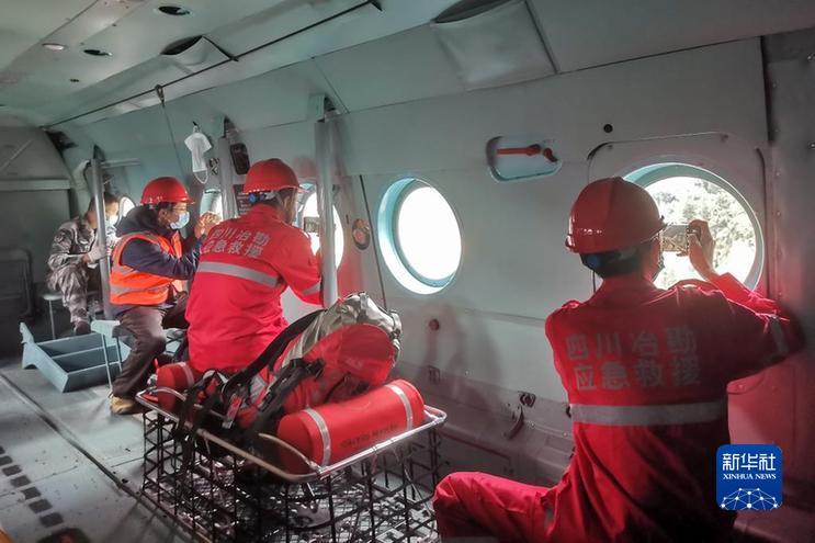 9月7日,四川省冶勘設(shè)計集團有限公司的調(diào)查隊員在前往海螺溝景區(qū)的直升機上拍攝。新華社發(fā)(四川省冶勘設(shè)計集團有限公司供圖)