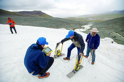 在格拉丹東雪山,科考隊員使用地質(zhì)雷達(dá)探測冰川。