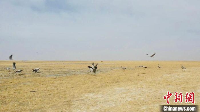 監(jiān)測(cè)顯示,格爾木市拖拉海草原是蓑羽鶴遷徙過(guò)程中的重要停歇地。每年十月初左右,少則數(shù)百只多達(dá)數(shù)千只蓑羽鶴都會(huì)聚集于此,補(bǔ)充能量,再蓄力南飛。它們?cè)谶@里涉水覓食,振翅高飛,水草豐美的濕地為它們提供了歇腳的舒適環(huán)境。