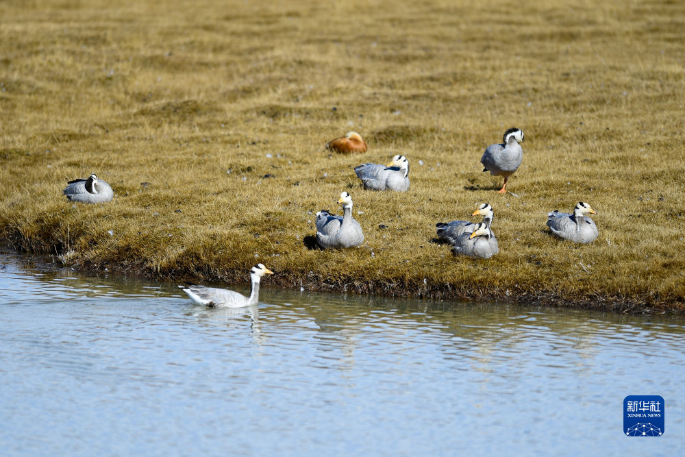 在三江源國家公園黃河源園區(qū)拍攝的一群斑頭雁。(新華社記者 李占軼 攝)