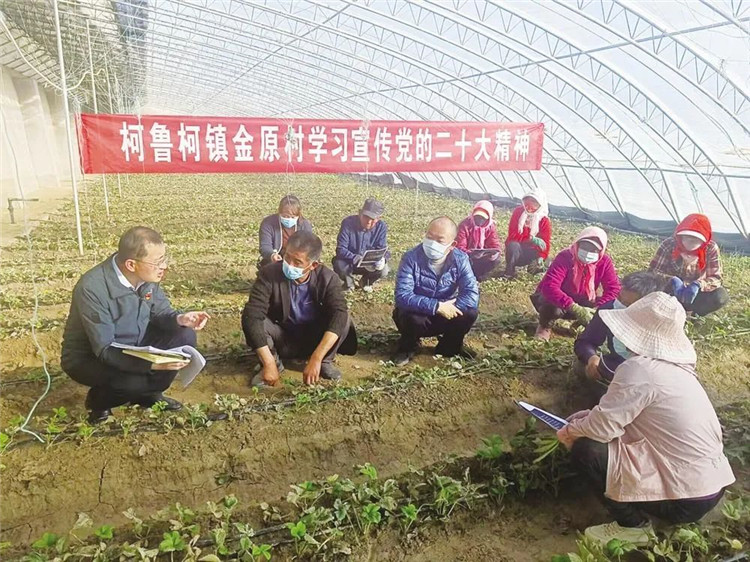 圖為青海省海西蒙古族藏族自治州德令哈市柯魯柯鎮(zhèn)金原村干部群眾在溫室大棚中進行黨的二十大精神交流學習 圖片來源:德令哈發(fā)布微信公眾號