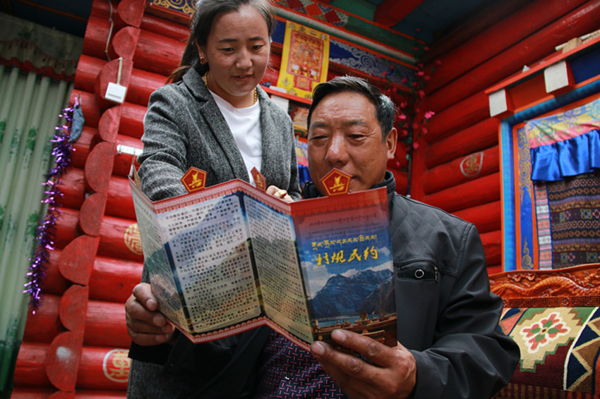 村民正在學(xué)習(xí)民族團(tuán)結(jié)進(jìn)步村規(guī)民約。