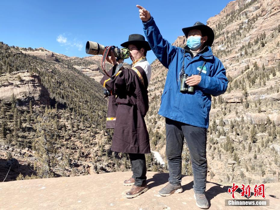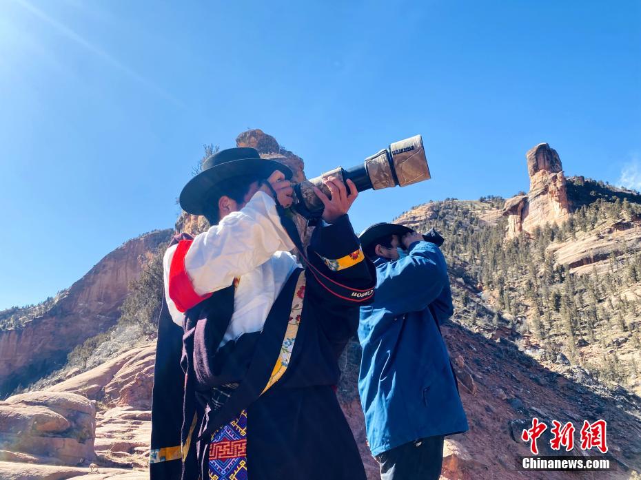 圖為達(dá)杰朋措(左)和生態(tài)管護(hù)員在瀾滄江源園區(qū)拍攝野生動物。仁青達(dá)杰 攝