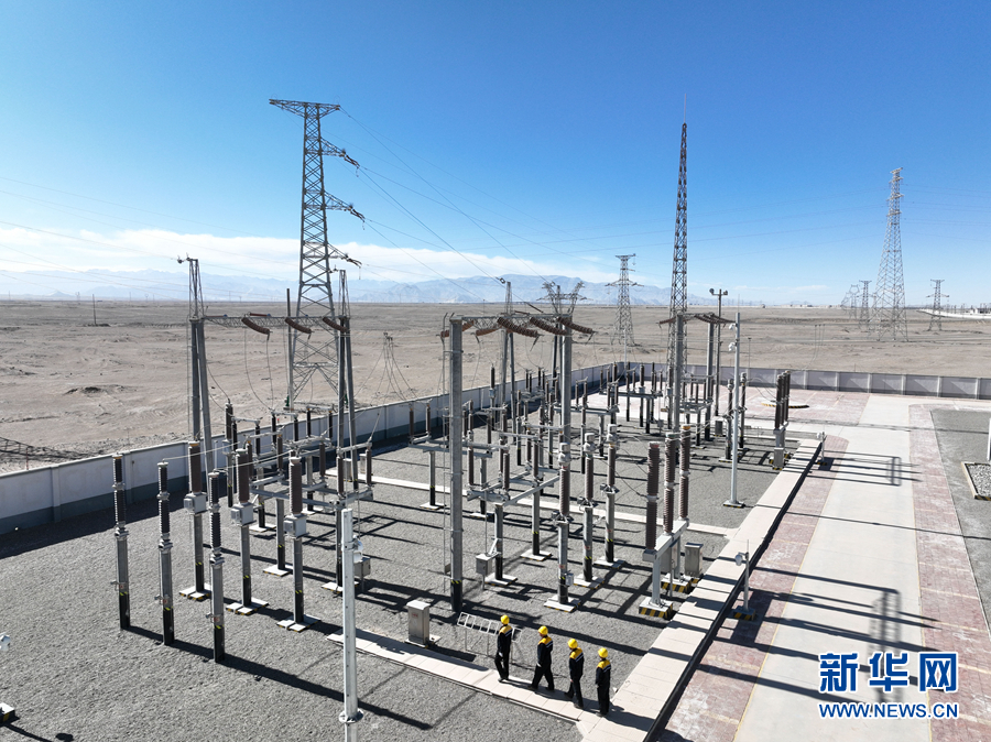 2月5日,在青藏集團(tuán)有限公司西寧供電段格爾木南變電所,王永忠(左一)與同事們在巡檢(無人機(jī)照片)。新華社記者 張龍 攝