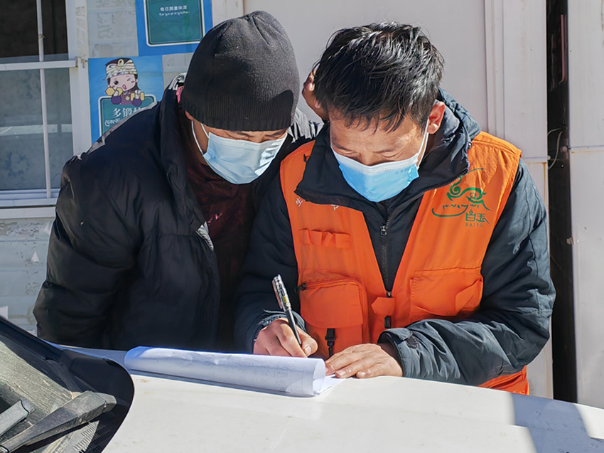 白瑪稱來(lái)(右)對(duì)過(guò)往駕乘人員進(jìn)行認(rèn)真登記