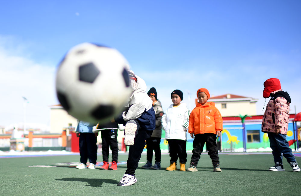 3月1日,在玉樹州治多縣,城南幼兒園小朋友桑周尼瑪(前)在練習(xí)射門。新華社記者 張宏祥 攝