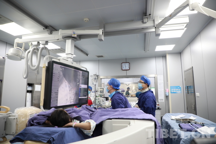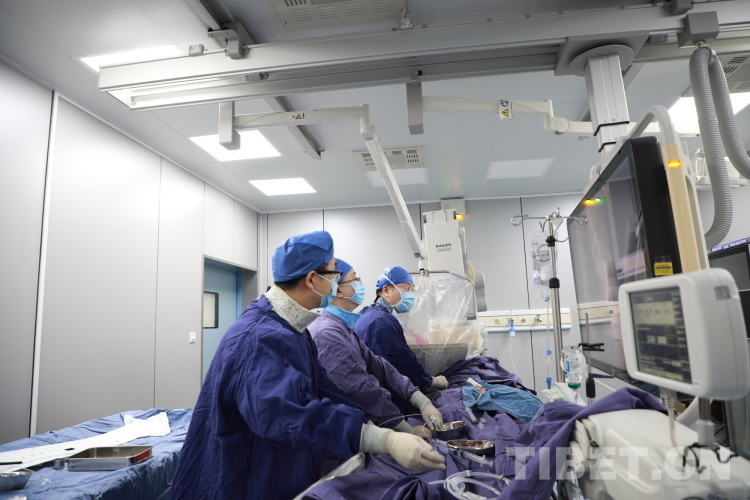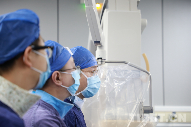 圖為北醫(yī)三院院長助理唐熠達(dá)教授(右一)帶領(lǐng)專家團隊在為來自青海省果洛藏族自治州的先心病患兒手術(shù)時觀察導(dǎo)管行進(jìn)情況 攝影:劉莉