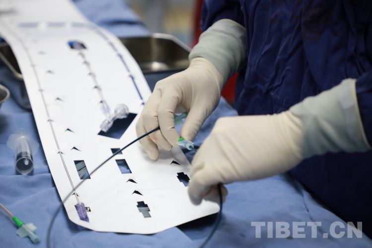 圖為北醫(yī)三院專家團隊在為來自青海省果洛藏族自治州的先心病患兒手術(shù)時使用的直徑僅4毫米的介入導(dǎo)管 攝影:劉莉