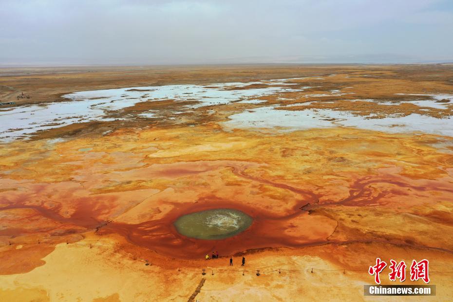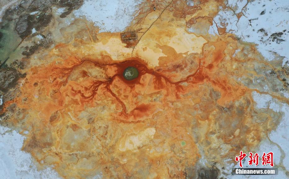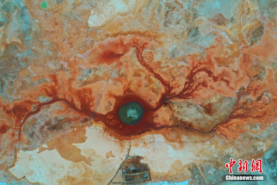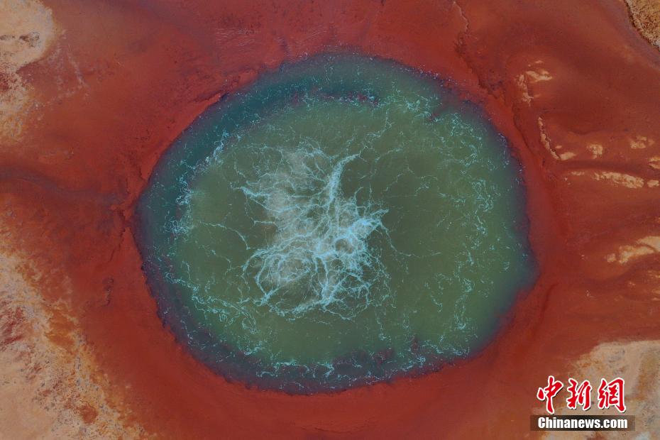 艾肯泉位于青海省海西蒙古族藏族自治州茫崖市花土溝鎮(zhèn)。艾肯”蒙語意為“可怕”,由于含硫量過高,泉眼周圍飛鳥野獸不敢靠近,泉水流經(jīng)的地方寸草不生。從空中俯瞰,泉眼與噴涌出的泉水及周圍土地上深紅色環(huán)帶狀的沉淀物,組成了一個奇特的瞳孔造型,仿佛一只鑲嵌在大地上的眼睛,因此被稱為“惡魔之眼”。圖為航拍茫崖市艾肯泉。