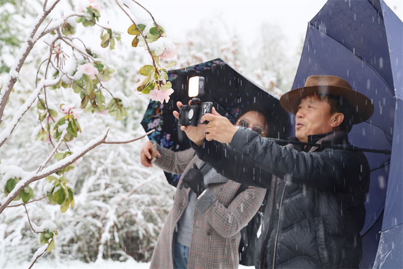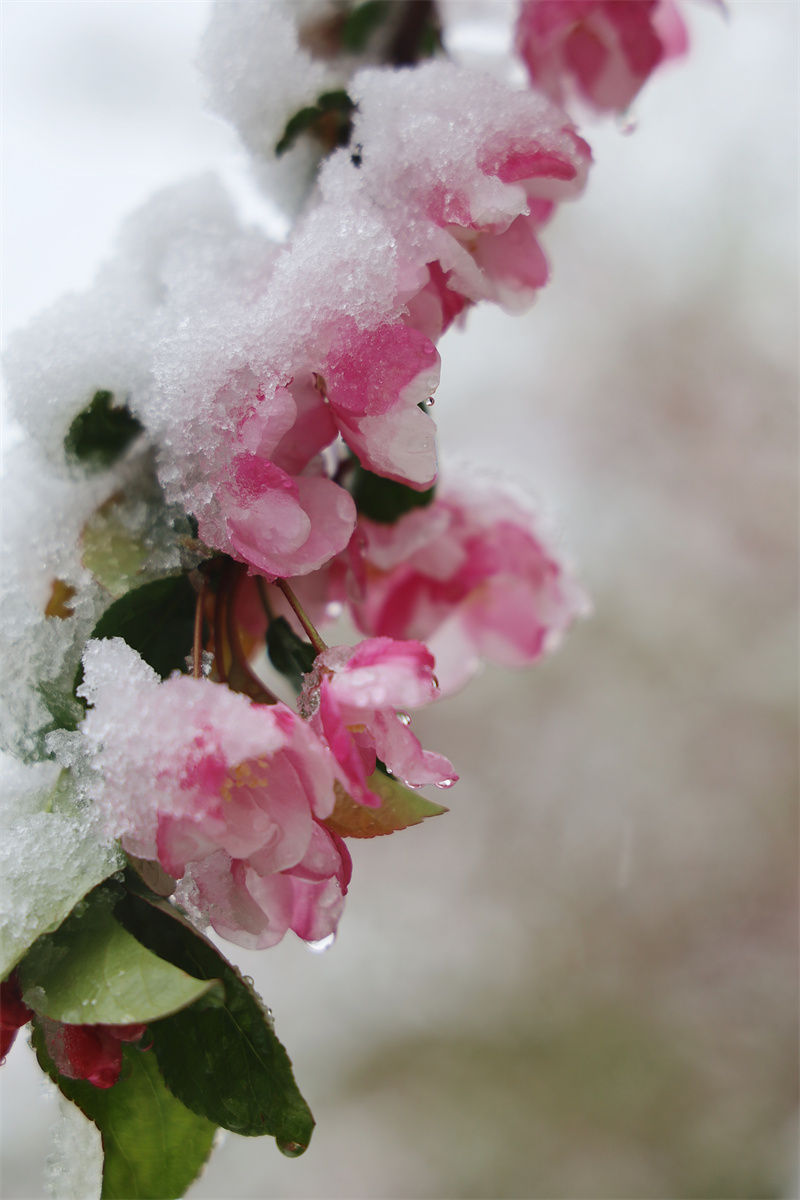 花映雪,雪融花,雪水晶瑩,花瓣嬌艷,攝影愛好者在大雪紛飛中記錄香格里拉的詩(shī)情畫意。