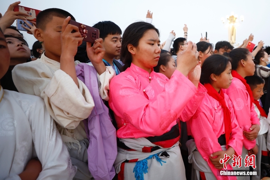 圖為觀看升旗儀式的藏族青少年們合影留念。中新社記者 富田 攝