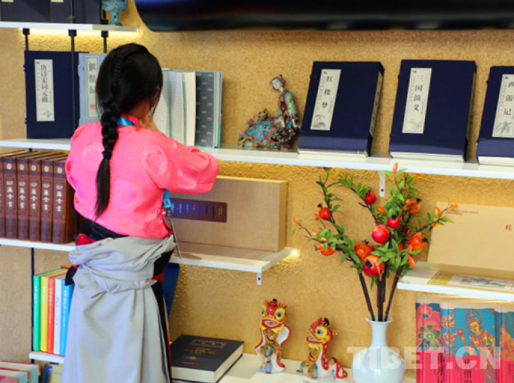 當(dāng)穿著藏裝的姑娘走過(guò)書(shū)架,翻開(kāi)四大名著,努力讀出上面的文字,在古香古色的書(shū)桌前,幾個(gè)姑娘爭(zhēng)先用毛筆描繪著宣紙上的小楷,那畫(huà)面美得像一幅幅仕女畫(huà)。