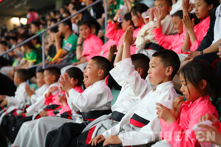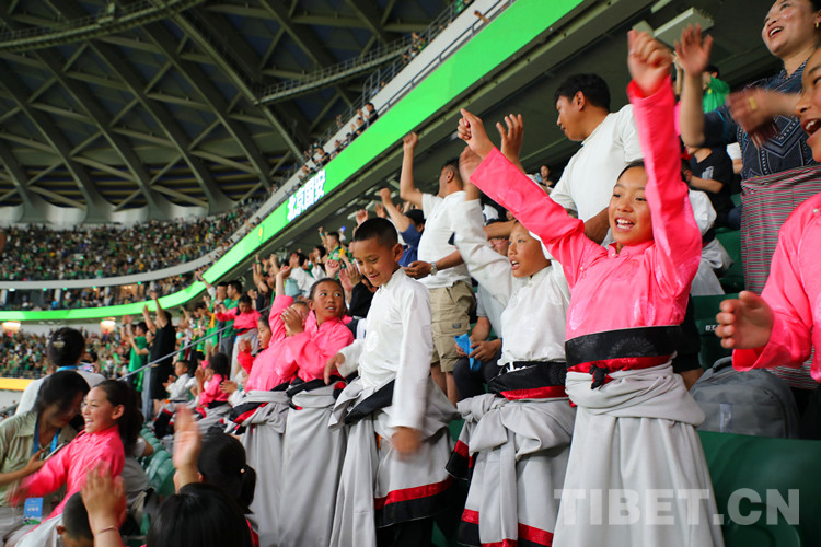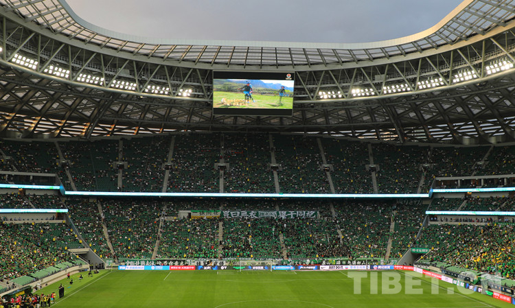 阿斌與5名小伙伴身著藏裝,牽手球員出現(xiàn)在賽場上,頓時吸引了全場目光。大屏還播放著三江源·北京情·中國心——青海玉樹藏族青少年北京行”的視頻,展示著雪域足球少年的風采,環(huán)形LED屏幕用中文、藏文雙語滾動播放著40位玉樹少年的名字。