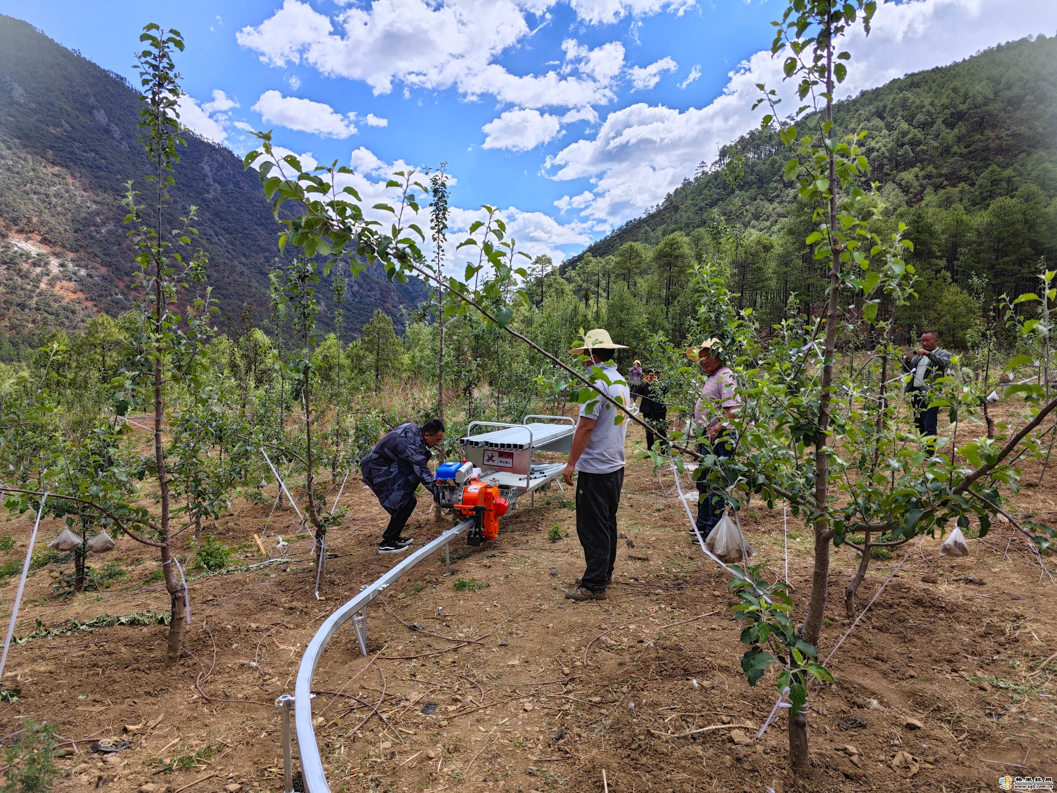 伴隨著鐵軌上傳來“哐哐”聲,香格里拉市洛吉鄉(xiāng)九龍村干溝組村民馬志高的蘋果園里,一輛果園軌道運(yùn)輸車正在試運(yùn)行。