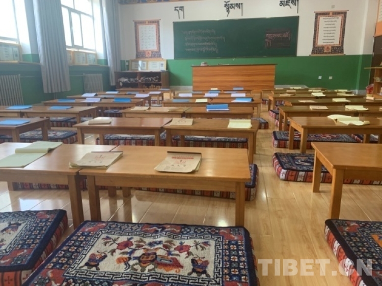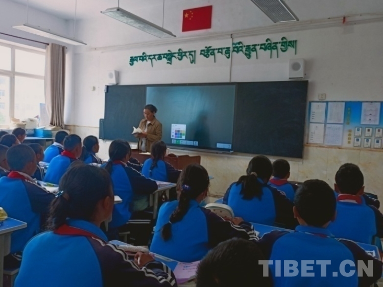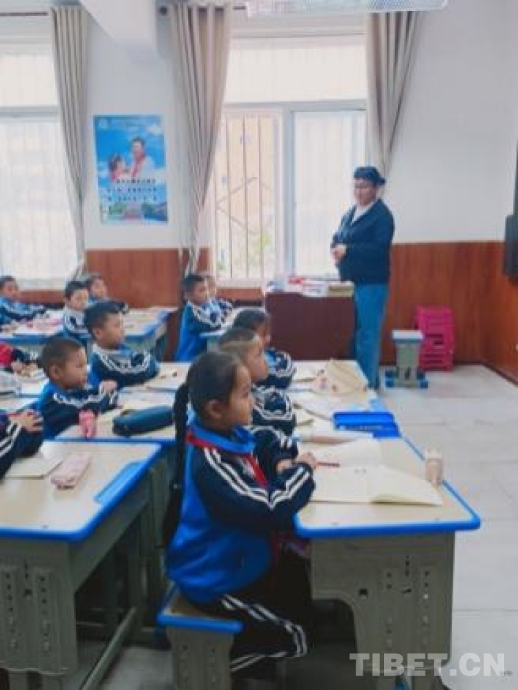圖為該校藏文老師加羊卓姆為六年級(jí)學(xué)生講授文法