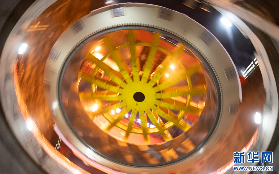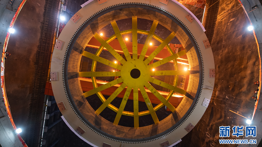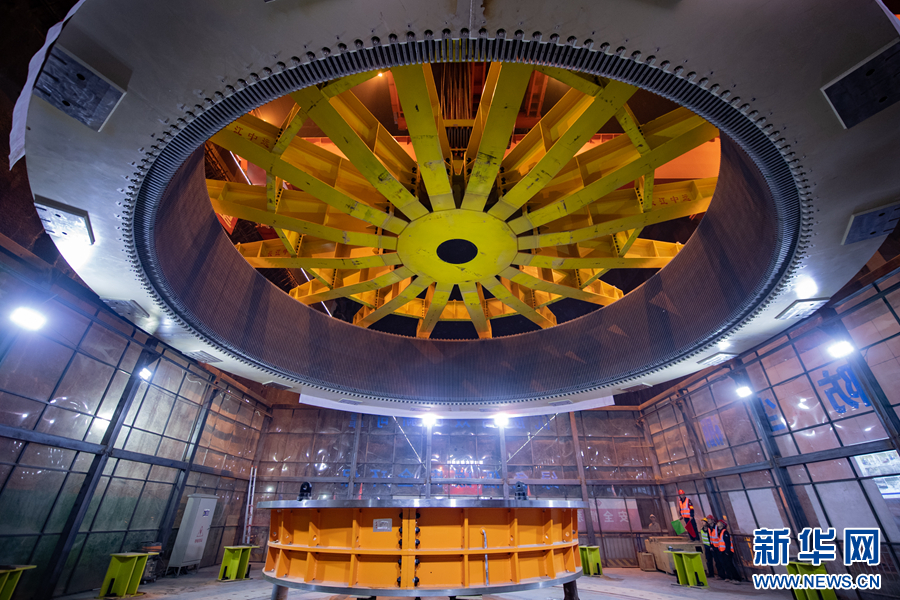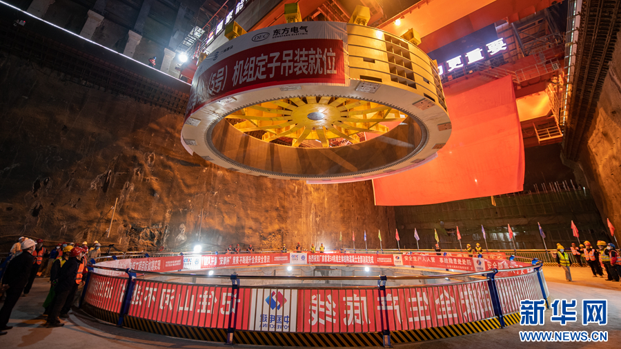 6月30日,瑪爾擋水電站地下廠房內(nèi),工作人員正在進行首臺機組定子吊裝作業(yè)。新華網(wǎng) 潘彬彬 攝