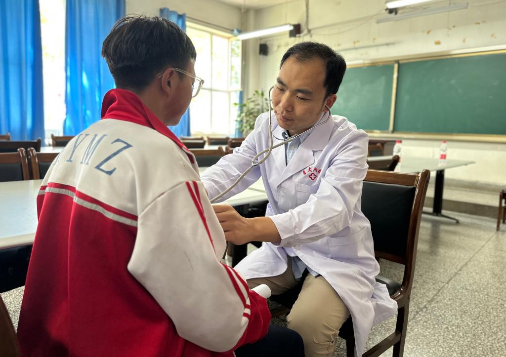 教學(xué)樓里,10名北京協(xié)和醫(yī)院的專家兩人一組,為200名學(xué)生進(jìn)行骨科、眼科、兒科綜合檢查?!翱凑胺?。佩戴眼鏡后一定要按期復(fù)查。課間可以摘下眼鏡按摩一下,避免過度用眼。”北京協(xié)和醫(yī)院眼科專家李冰一邊拿著檢眼鏡細(xì)心檢查,一邊耐心地講解用眼知識。