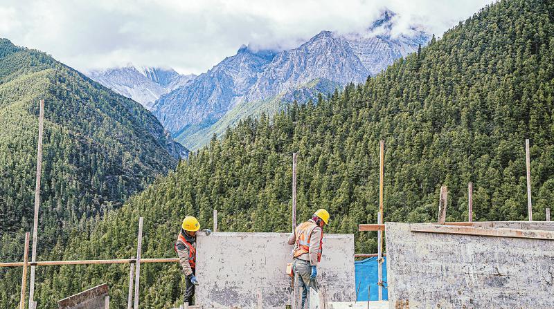 來到亞丁村中心,在一棟“黑藏房”的第三層,工人們正在施工?!澳銈兛矗赃呥@棟房子就是傳統(tǒng)樣式,是一戶一幢、二樓一底的結(jié)構(gòu),第三層中間會有一個露臺,呈‘凹’字形,但過去出租房屋的村民和民宿老板為了多建幾間客房,在第三層的露臺加蓋了房間?!蓖豕鹎钢慌缘慕ㄖf,“現(xiàn)在我們整體打造后,會還原這個露臺。”