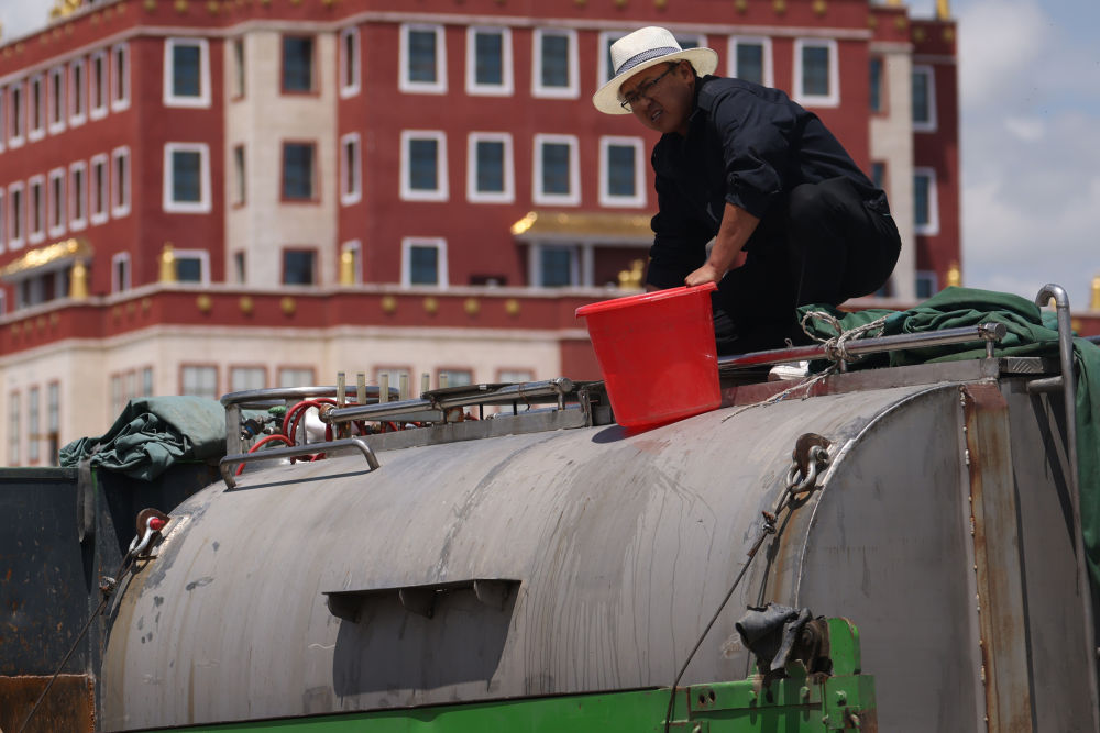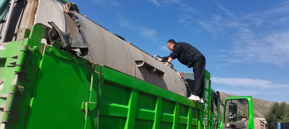 車輛進(jìn)入一處服務(wù)區(qū)后,緩緩?fù)?吭诼愤?。李瑾翻身跳下車去,爬?米多高的車頂,打開水箱蓋細(xì)細(xì)查看,有幾條小魚在水面上游動著,似乎好奇地向外張望。